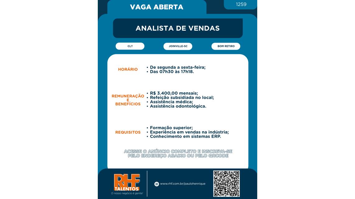Analista de Vendas [1259] - Bom Retiro - Joinville-SC